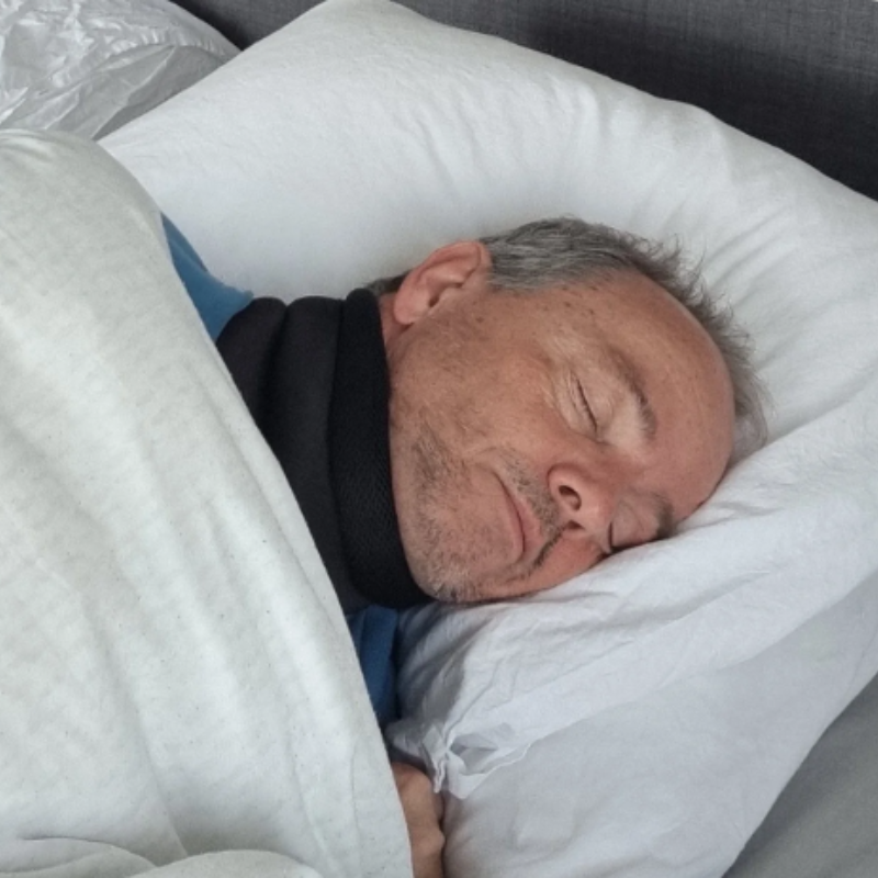 Está diseñado para personas con ronquidos, apnea del sueño, dolor de cuello u otras molestias cervicales. El producto cuenta con una correa ajustable en la parte posterior, lo que lo hace accesible para todos.