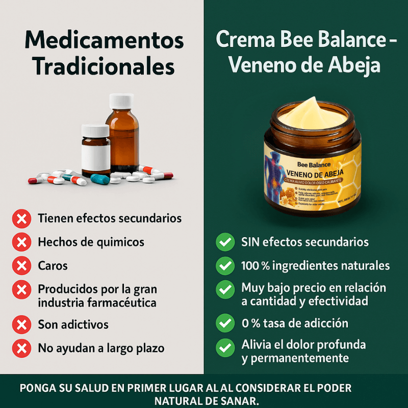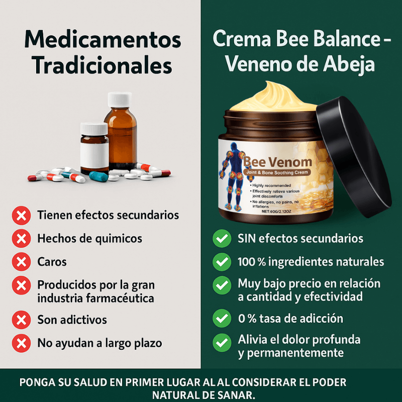 La crema de veneno de abeja Bee Balance ofrece una alternativa natural, segura y eficaz frente a los medicamentos tradicionales. Mientras estos suelen contener químicos que provocan efectos secundarios, dependencia y alivio temporal, la crema Bee Balance está formulada con ingredientes 100 % naturales que actúan directamente sobre las articulaciones y los músculos, proporcionando un alivio profundo, rápido y duradero.